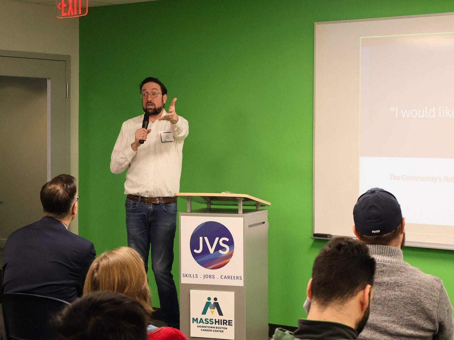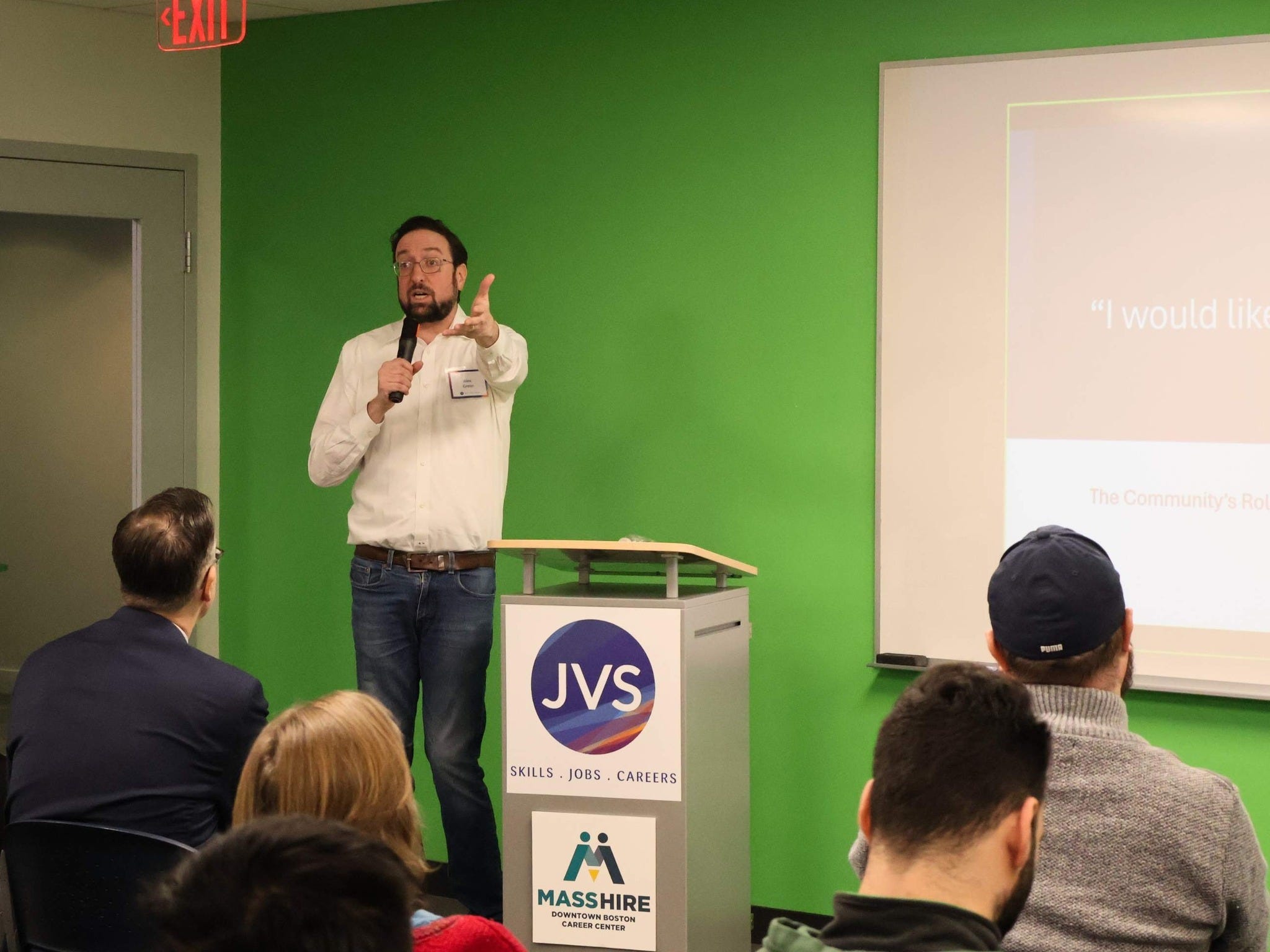 Image Description: Alex Green, a tall guy in a white oxford shirt and jeans, lectures on his book A Perfect Turmoil: Walter E. Fernald and America’s Struggle to Care for the Disabled at JVS Boston. You can spend the time you would need to read this post ordering Alex’s National Critic’s Circle Award Finalist for Biography from your favorite local bookseller. That’s a better way to spend your time. Get to it. Also, no, I am not horrified by the size of my bald spot. Why do you ask?