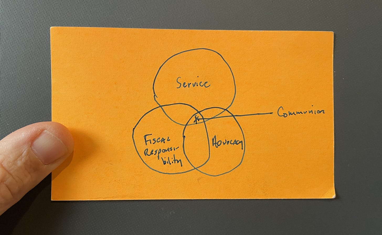 Picture Description: a shoddily drawn Venn Diagram on an orange index card. There are three elements in the diagram that are represented by circles. The top element is named service, the bottom left element is named fiscal responsibility, and the bottom right element is named advocacy. The intersection or overlap of the elements is identified as communion.