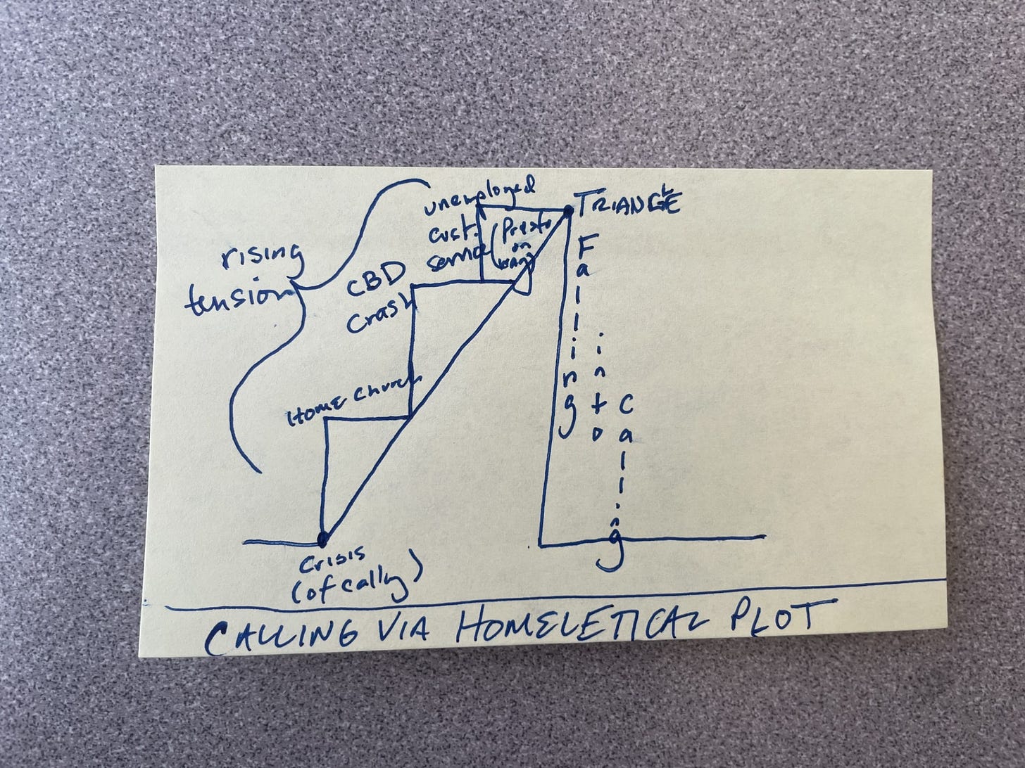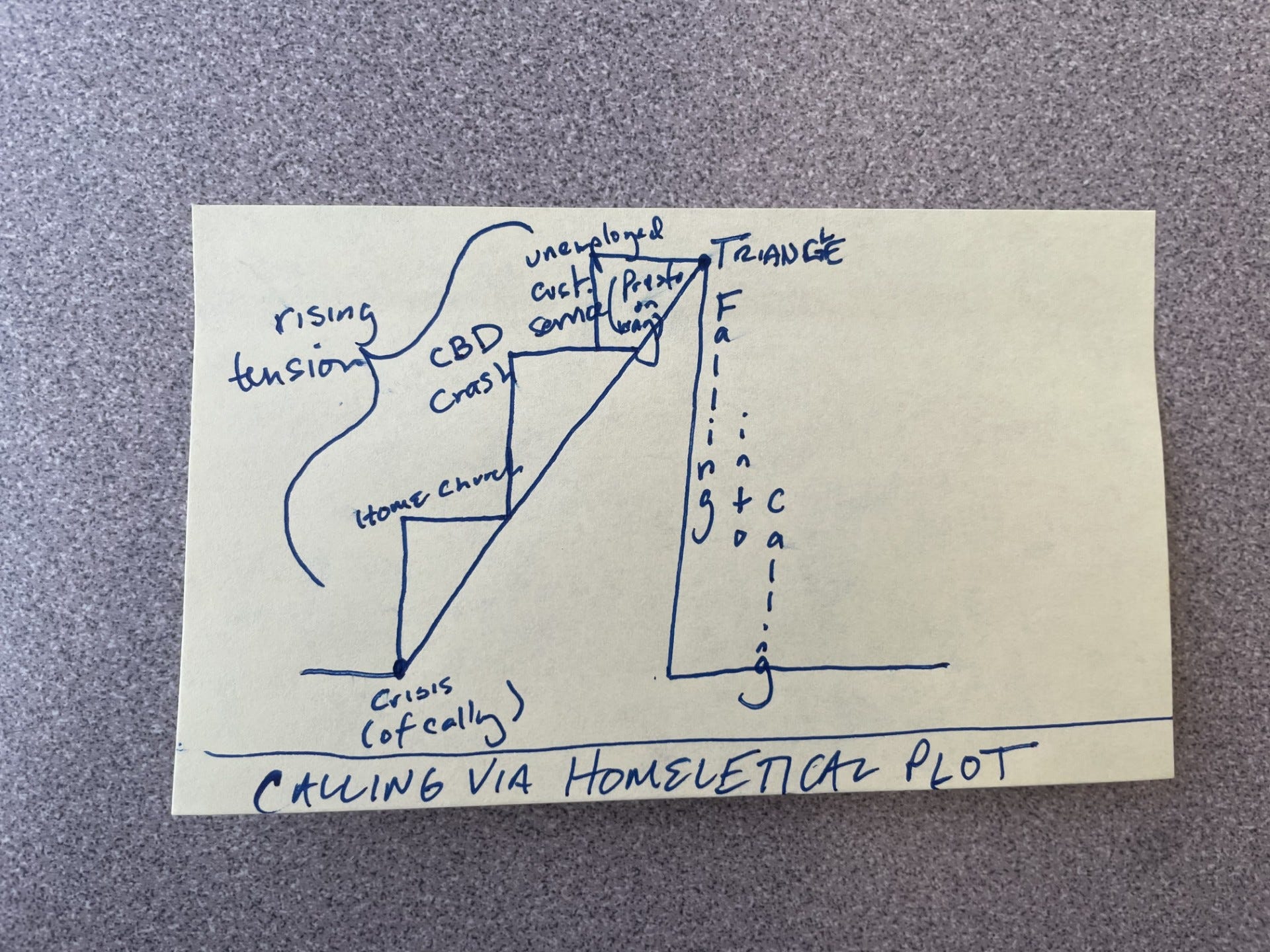 The other model, which had been in vogue in mainstream protestant pulpits for some time, but was relatively new to evangelical pastors, was the inductive model. If the deductive model is a pyramid right side up with the thesis on top, the inductive is an inverted pyramid[1] with a base of observations, ideas, and illustrations, tapering down to the thesis or an idea at the bottom. Another way to frame the inductive model is that it starts with disruption and then works its way towards resolution. The hard to decipher Post-It above is one way to model the inductive movement from disruption to resolution via rising tension.
